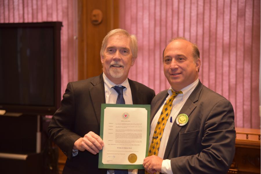 On October 1, 2015, City Manager Ed Augustus kicked off the celebration of World Smile Day and Fall into Reading month by reading Too Much Glue with preschool children who visited City Hall. Children enjoyed story time with Smiley. Moe Bergman delivered the Mayor's Proclamation for World Smile Day and Worcester Reads, October 2,2015. Throughout the morning, the message was clear Worcester Smiles. Worcester Reads.